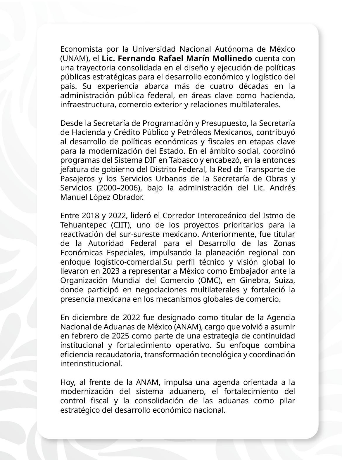 Semblanza del Titular Lic. Rafael Fernando Marín Mollinedo Titular de la Agencia Nacional de Aduanas de México (ANAM)
