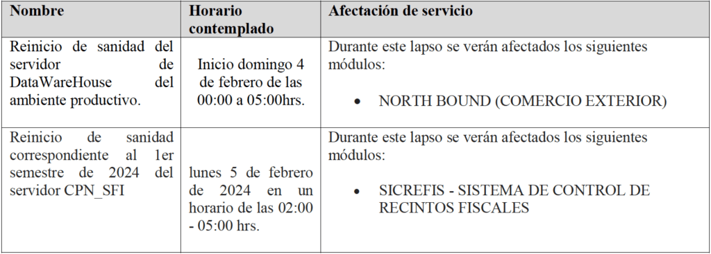 Se hace de su conocimiento que está programado, que el próximo domingo 4 y lunes 5 de febrero del año en curso, se lleven a cabo las ventanas de tiempo que se detalla a continuación: