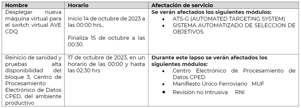 Se hace de su conocimiento que está programado, que el próximo sábado y domingo 14, 15 y 17 de octubre de 2023, se lleven a cabo las ventanas de tiempo que se detalla a continuación: