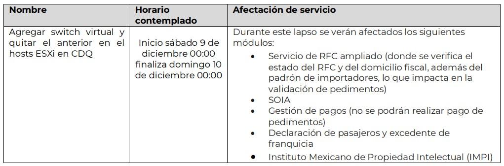 Por lo anteriormente expuesto, se exhorta a los usuarios de comercio exterior que lleven a cabo la validación y pago de los pedimentos con antelación a la fecha y horario programada para esta ventana de mantenimiento, para con ello, puedan realizar sus operaciones de comercio exterior sin contratiempos.”.