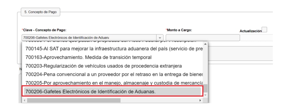 Se hace de su conocimiento que se realizó una actualización al formulario mediante el cual se generan Líneas de captura, para el trámite denominado “Otorgamiento del Gafete Electrónico”, dentro del apartado “5. Concepto de pago” el cual surtirá efectos; a partir de la fecha de publicación del presente boletín, por lo anterior, se tendrá que seleccionar la clave “700206 – Gafetes Electrónicos de Identificación de Aduanas”, como se muestra a continuación: