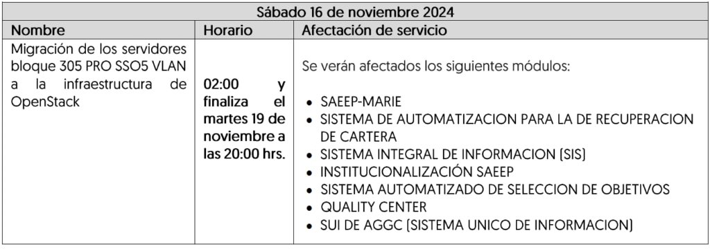 Se hace de su conocimiento que esta programado, que el próximo sábado 16 y domingo 17 de noviembre de 2024, se lleven a cabo las ventanas de tiempo que se detalla a continuación: