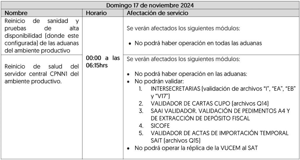 Por lo anterior, se exhorta a los usuarios de comercio exterior a tomar las acciones pertinentes para reducir el impacto, anticipando sus operaciones urgentes. Al termino de los eventos, se deberá validar el funcionamiento de cada uno de los aplicativos, en caso de existir alguna incidencia, levantar un reporte a mesadeservicios@www.anam.gob.mx
